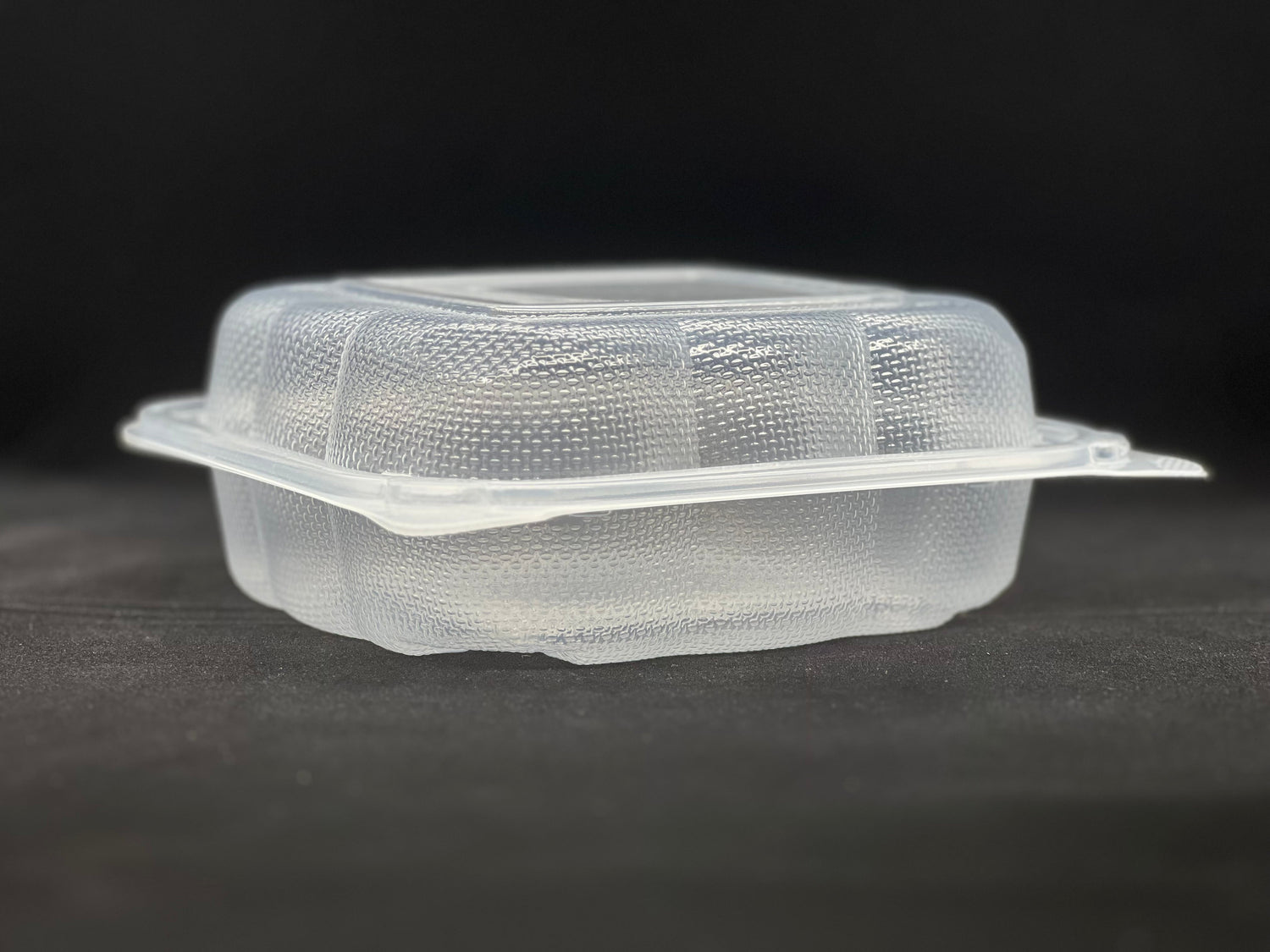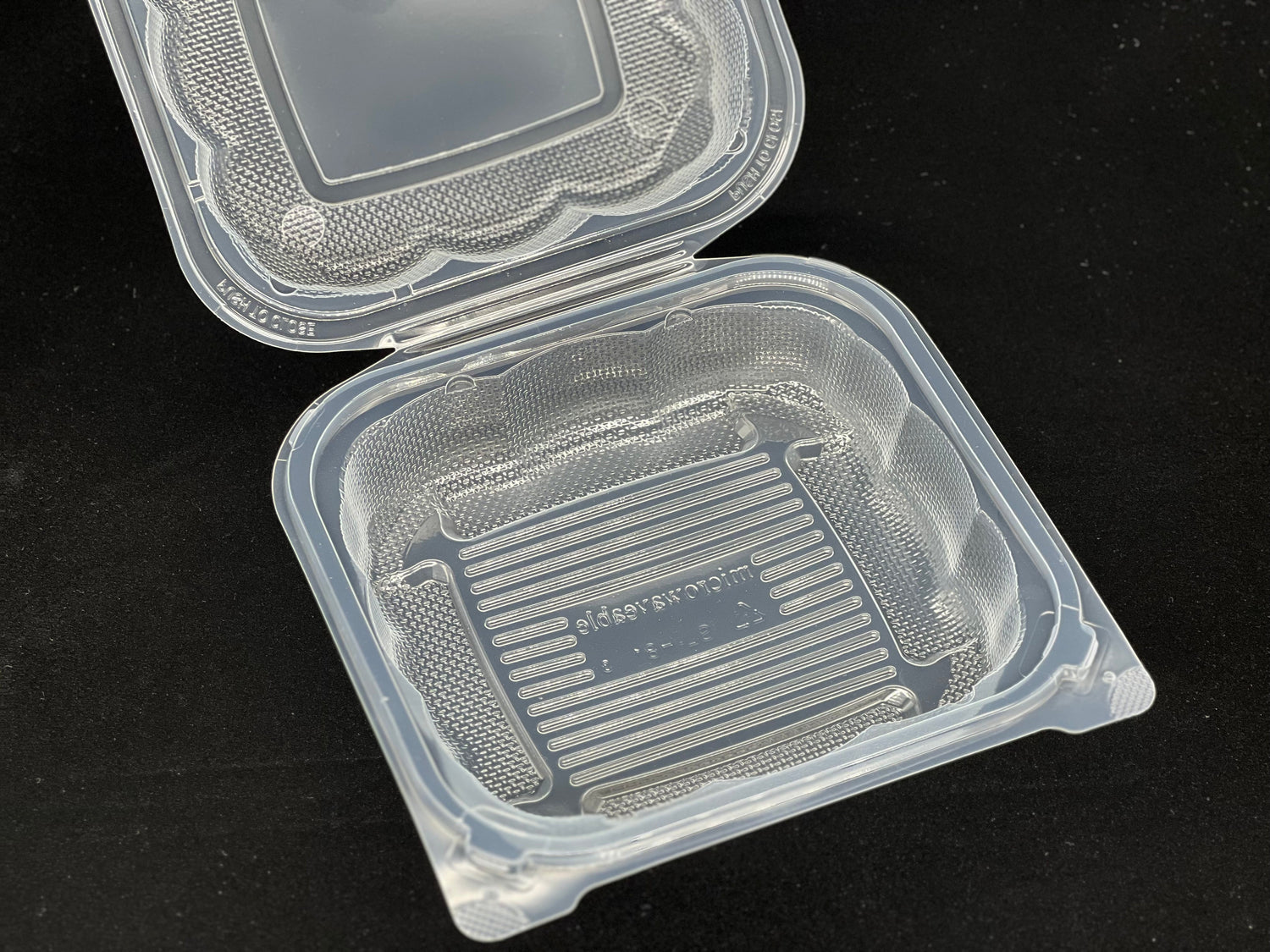 Plástico tipo concha articulado, translúcido, 9*9*2,95, 1 compartimento, 150 unidades/caixa